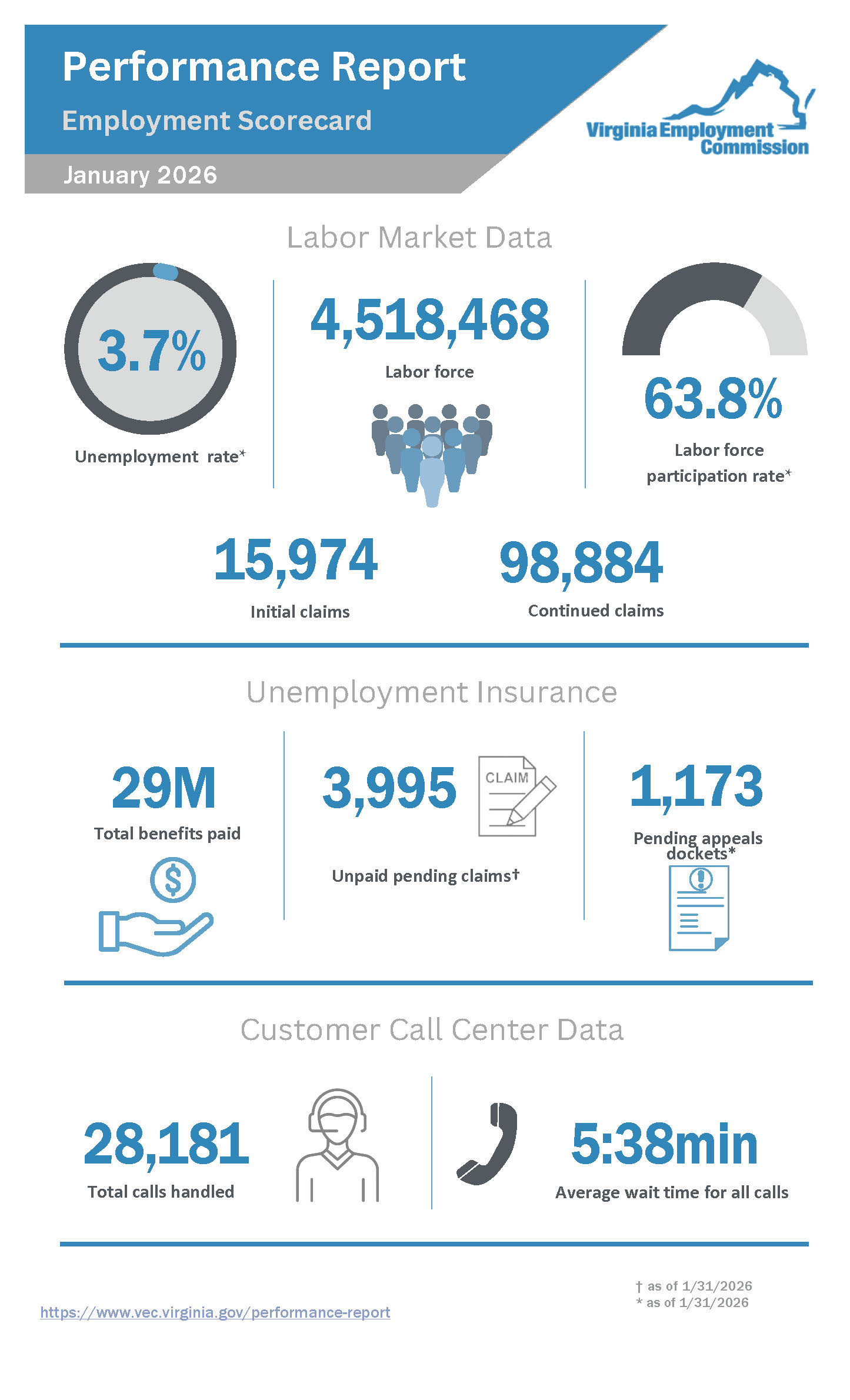 Agency Monthly Performance Report for January 2026For Release:April 10, 2026Contact:Kerri O'BrienVEC Director of Communicationspio@vec.virginia.govPDF of Report(1.04 MB)